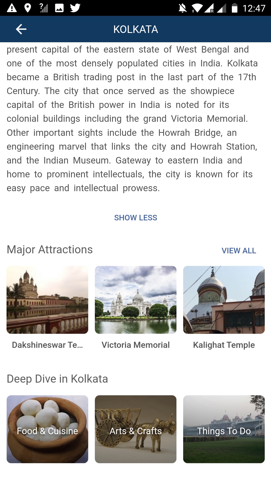 Appen är uppdelad i olika delar, Hem, Destinationer, Upplevelser och Om Indien.
