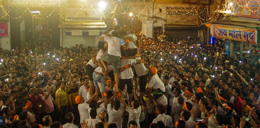 Festivalen inkluderar dramatiska iscensättningar av Krishnas liv, och det finns också speciella firanden runt städerna Mathura och Vrindavan. Dahi Handi är en del av att fira Krishnas lekfulla och busiga sida, där lag av unga män bildar mänskliga pyramider för att nå en högt hängande lergryta med kärnmjölk och slå ner den.