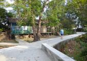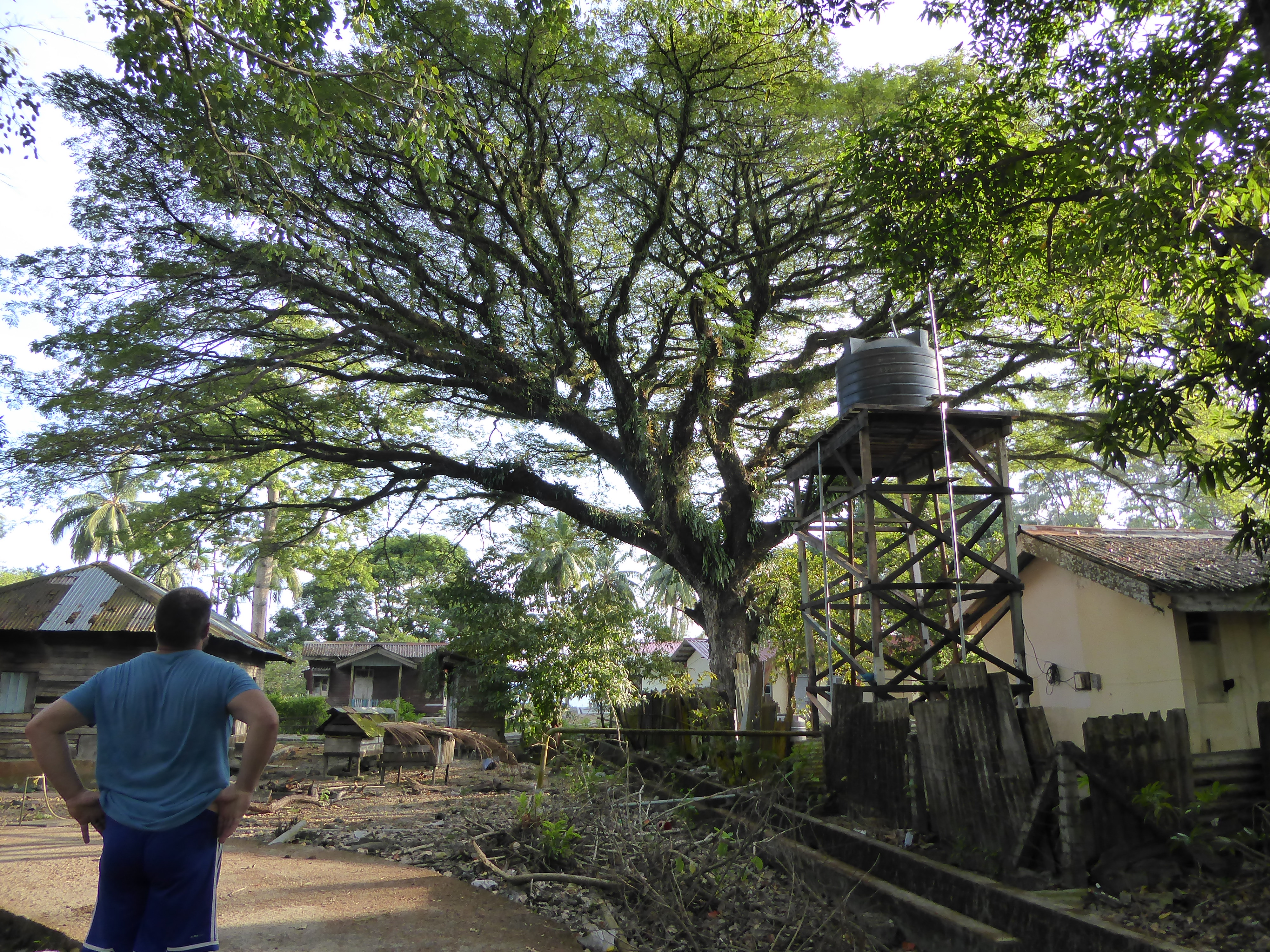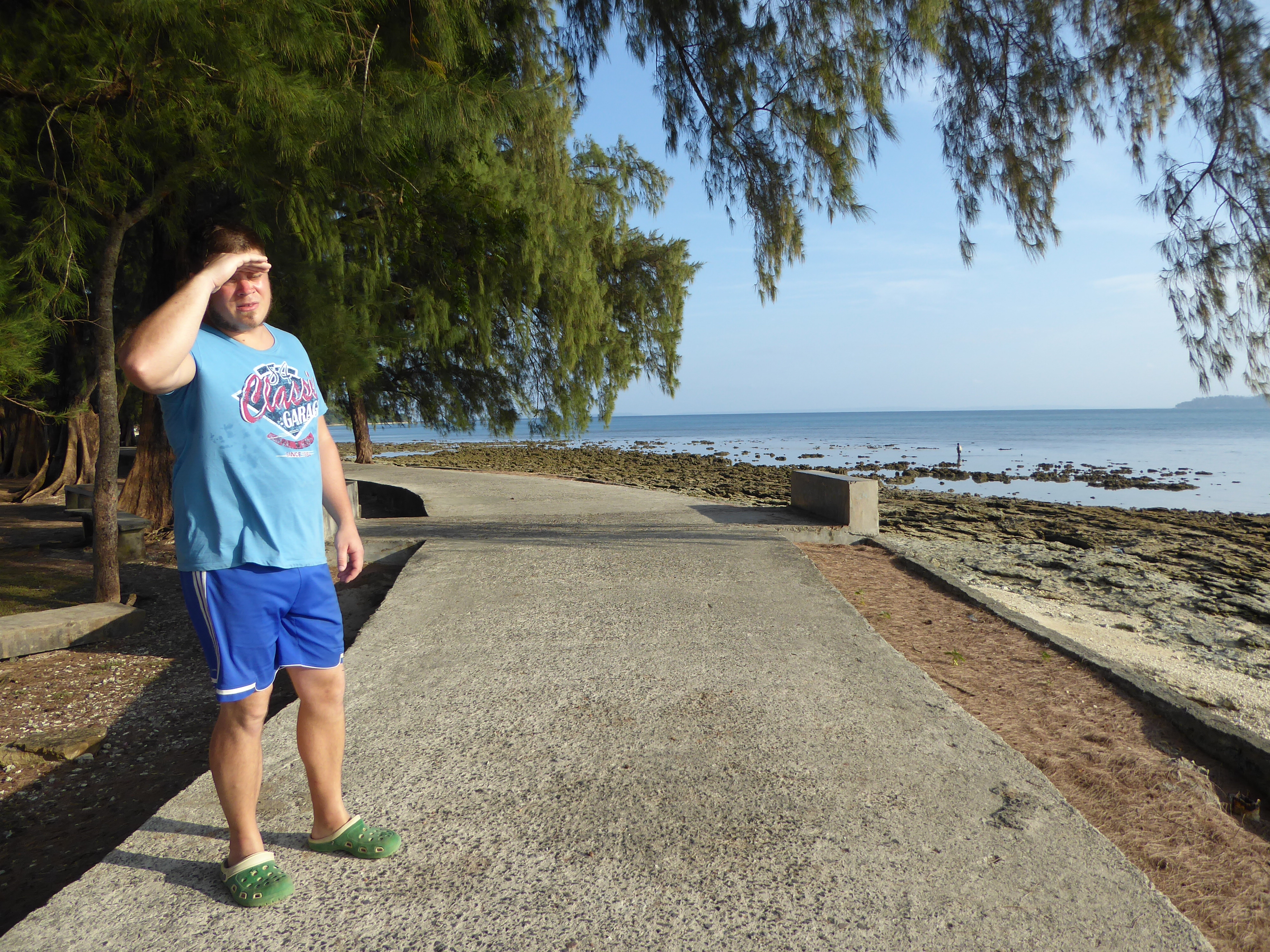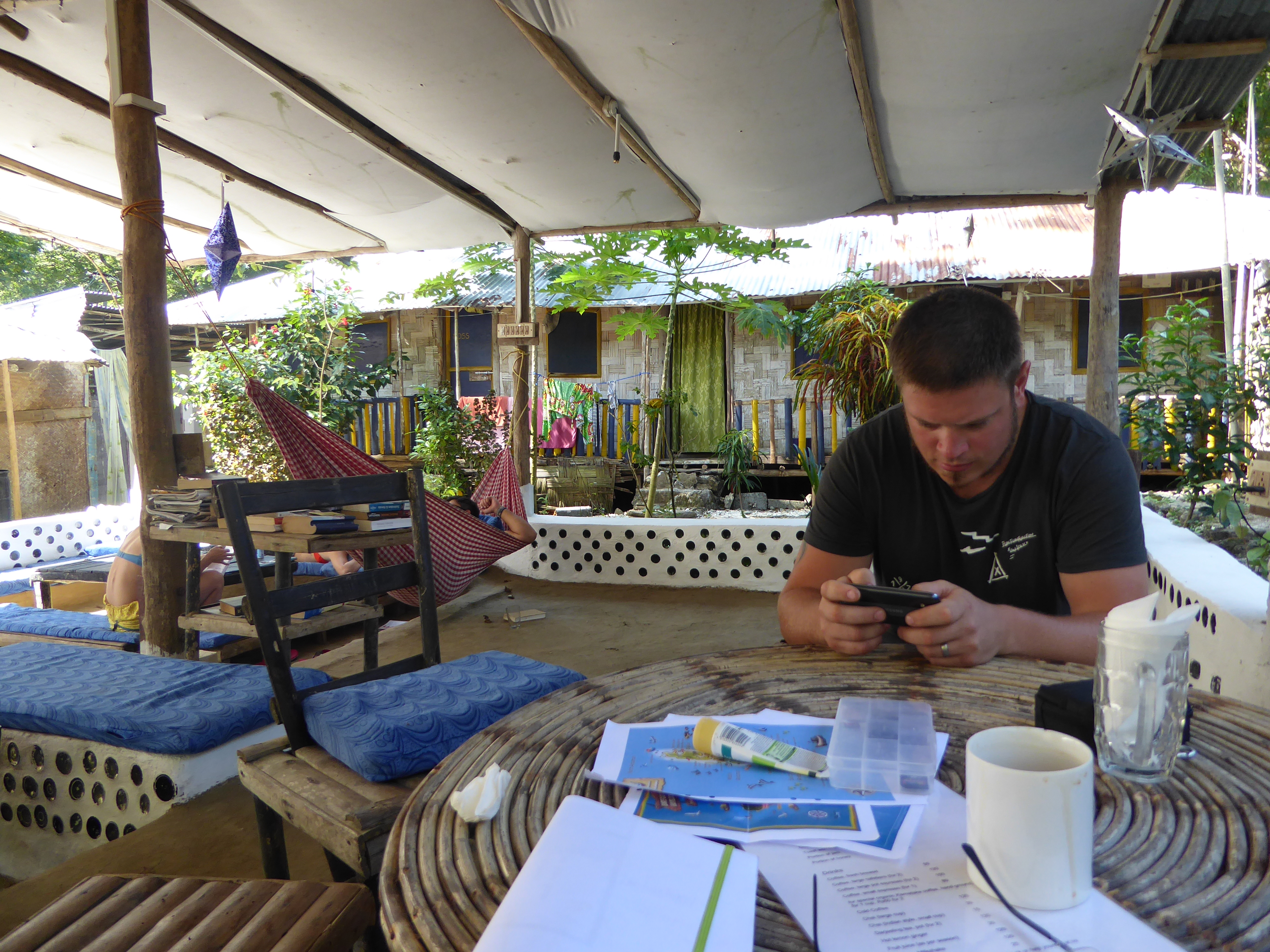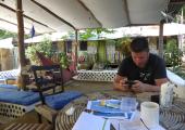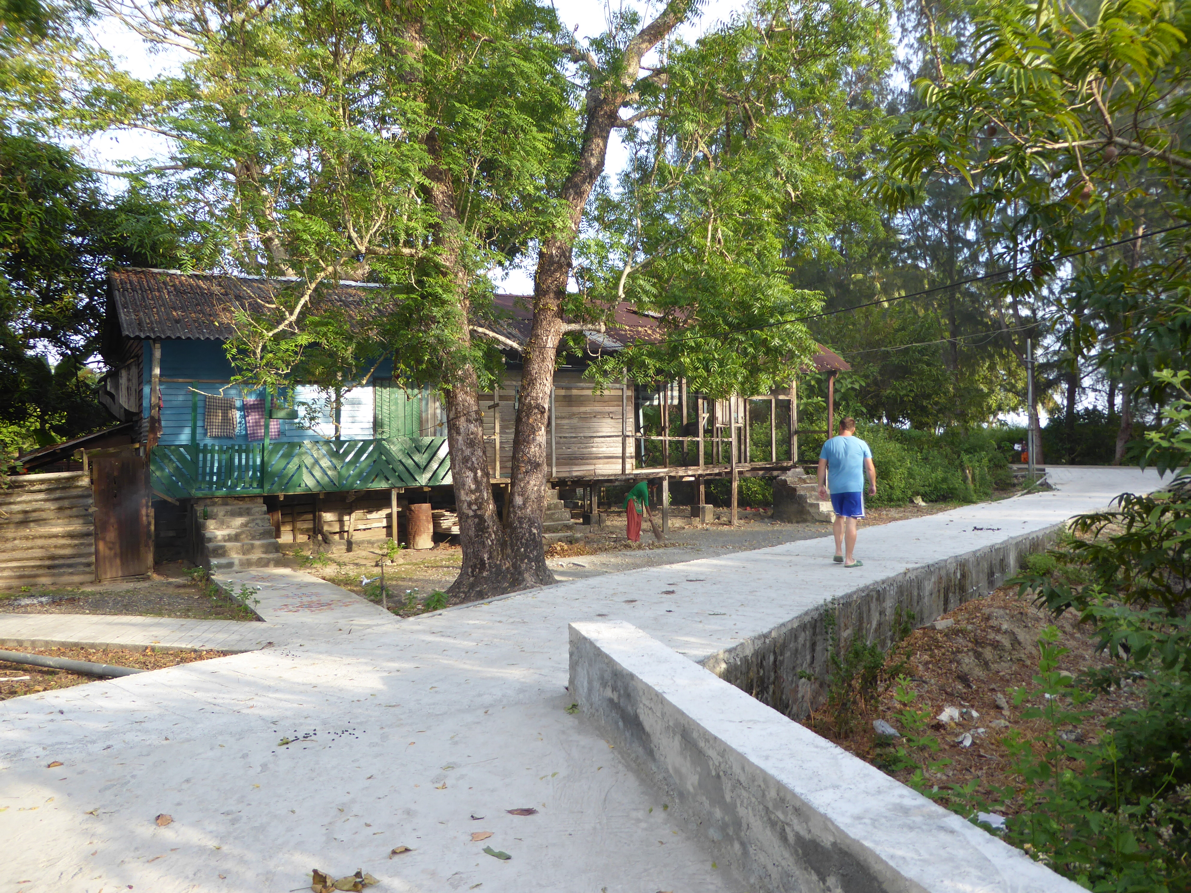 Det var ändå dags att gå då om vi skulle hinna tillbaka genom djungeln innan solen gick ner. Fredrik utrustade sig med en pinne att försvara sig med ifall den ilskna hunden skulle dyka upp igen. Men den var inte kvar när vi kom dit, det var skönt att slippa se den igen. När vi kommit tillbaka till Blue Planet berättade vi om vår träff med den ilskna hunden och en av de anställda där skjutsade Fredrik på deras moped till läkaren på ön. Mottagningen var stängd men praktiskt nog så bodde läkaren i huset bredvid så det var bara att knacka på där. Det var ingen större fara med såret, de hade ingen rabies där ute men han fick en stelkrampsspruta och ett par tabletter, fråga mig inte vad det var.