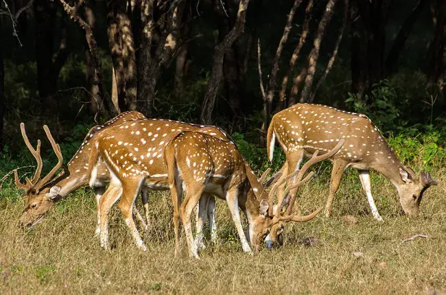 Axishjorten påminner lite om dovhjorten och sikarhjorten då de alla tre har vita prickar. Axishjorten är dock något mindre än de övriga två med sina 100 kg. Hornen på hanarna har bara tre taggar på vardera sida men kan ändå växa imponerande stora.