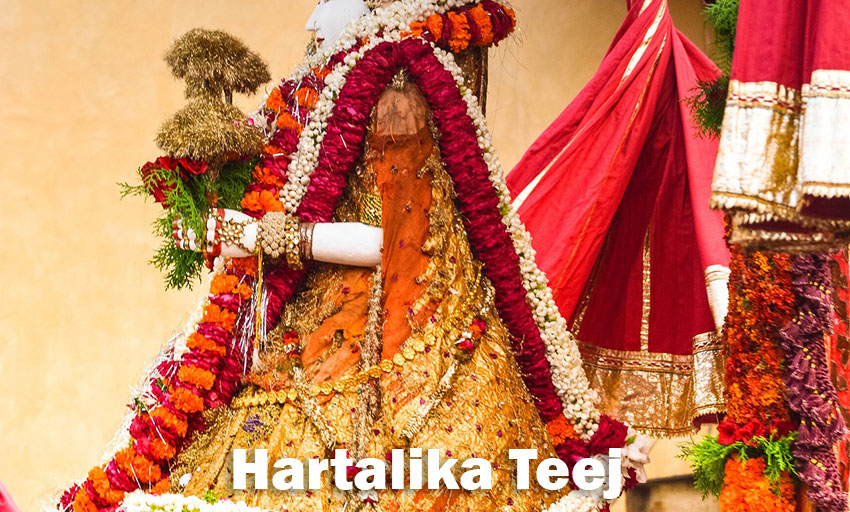 Hartalika Teej firas för att fira återföreningen av Lord Shiva och gudinnan Parvati. Under festivalen klär man idolen av Parvati Mata i ljusa och färgglada kläder och tar ut den i en bärstol i en procession. Detta följs ofta av ett tåg av elefanter och kameler som är en av de mest attraktiva delarna av Teej-processionen.