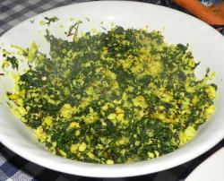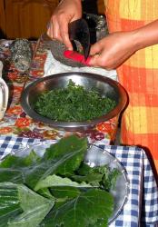 3. Mortla de små rödlökarna med gurkmejan och kokosen. Blanda ihop kokosblandningen med pumpabladsblandningen.