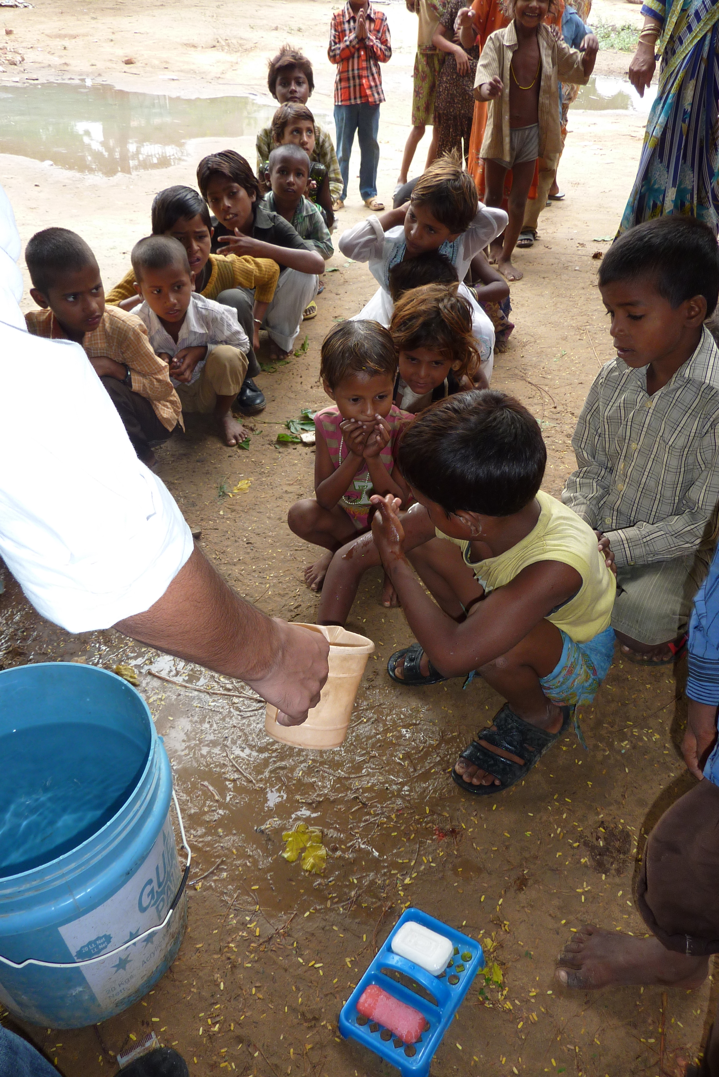 Vi borjar morgonen med att ga runt och hamta upp de barn som inte sjalvmant kommer till skolan, darefter delar vi ut frukost och sedan tvattar barnen ansikte och hander samt borstar tanderna, darefter satter lektionerna igang.