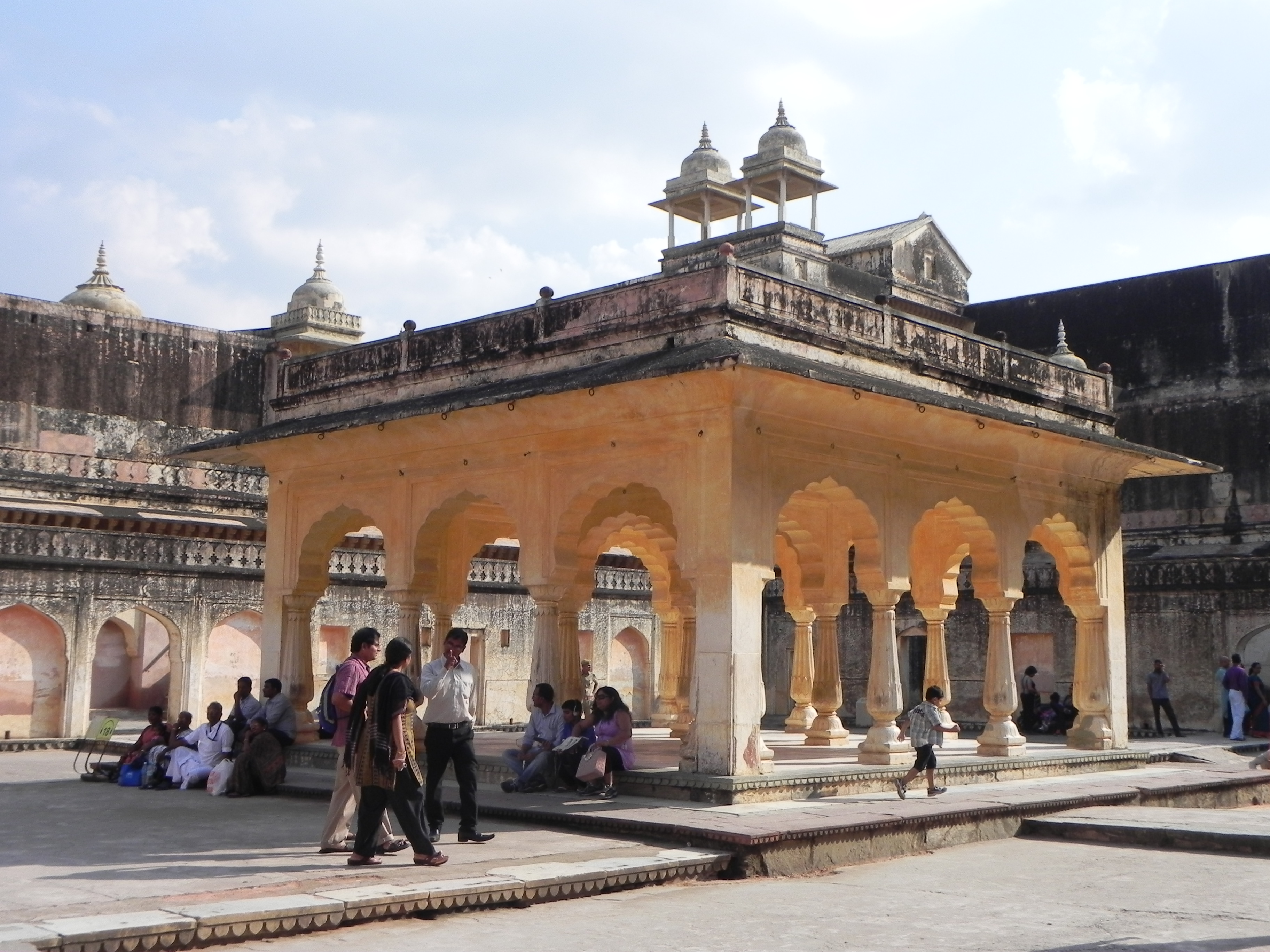 Så har vi beskådat Hawa Mahal, vindarnas palats, från gatuvivån, och förmiddagssolen belyste den rosa-okra kronformade fasaden, med många genombrutnafönster, baklonger o alkover. Det funkade som haremdamernas lila nöje. De fick nöja sig med att se omvärlden härifrån. Var gatan lika myllrande då så hade de väl fullt göre kan man tänka.